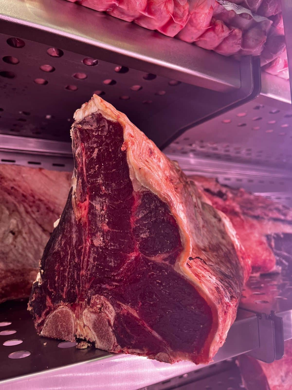 Corte grueso de ribeye con el hueso largo expuesto. Muy jugoso y vistoso, ideal para asar y presumir parrilla.